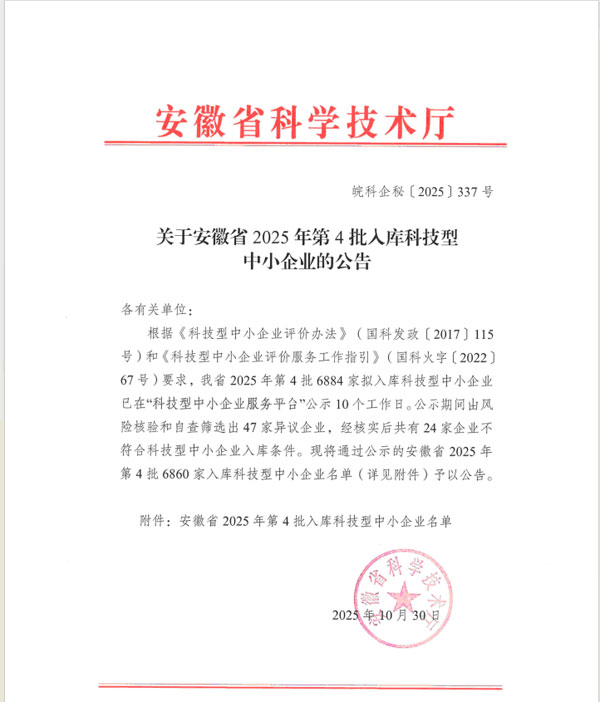 发布人:科迪达化工 发布时间:2025-11-06 浏览次数:509近日,安徽省科学技术厅发布2025年第四批入库科技型中小企业名单,安徽科迪达化工有限公司凭借在科技创新方面的扎实积累,成功入选。